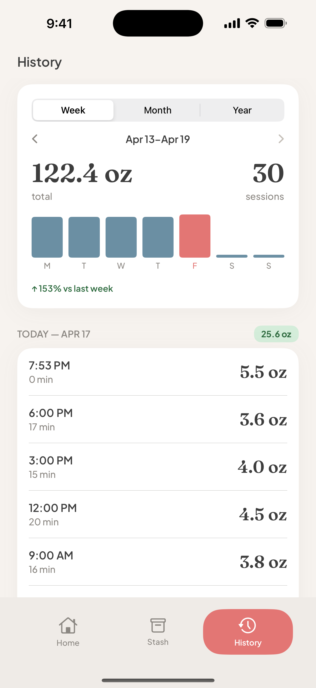 Every session, every ounce — ready to leave with you. Pull a clean CSV or a shareable PDF in two taps.
